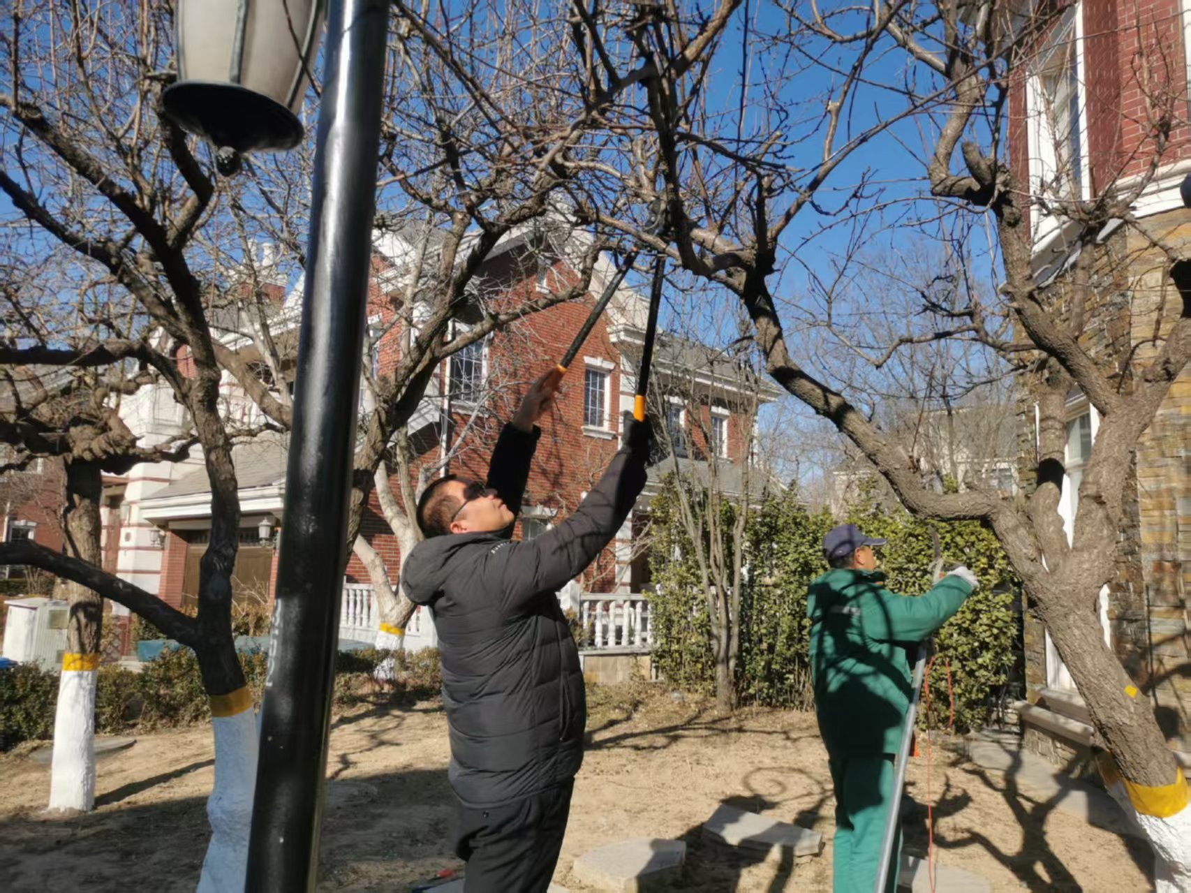 枝條修剪:去除競爭枝、平行枝、向下枝、病蟲枝 ,逐步形成高大的樹身和飽滿的樹冠形態(tài)。并且,修剪并非一次就能完成,需要逐年進行,以調(diào)整樹干和樹冠的比例,使其更加合理。同一樹齡和品種的樹木,分支點高度應保持一致。